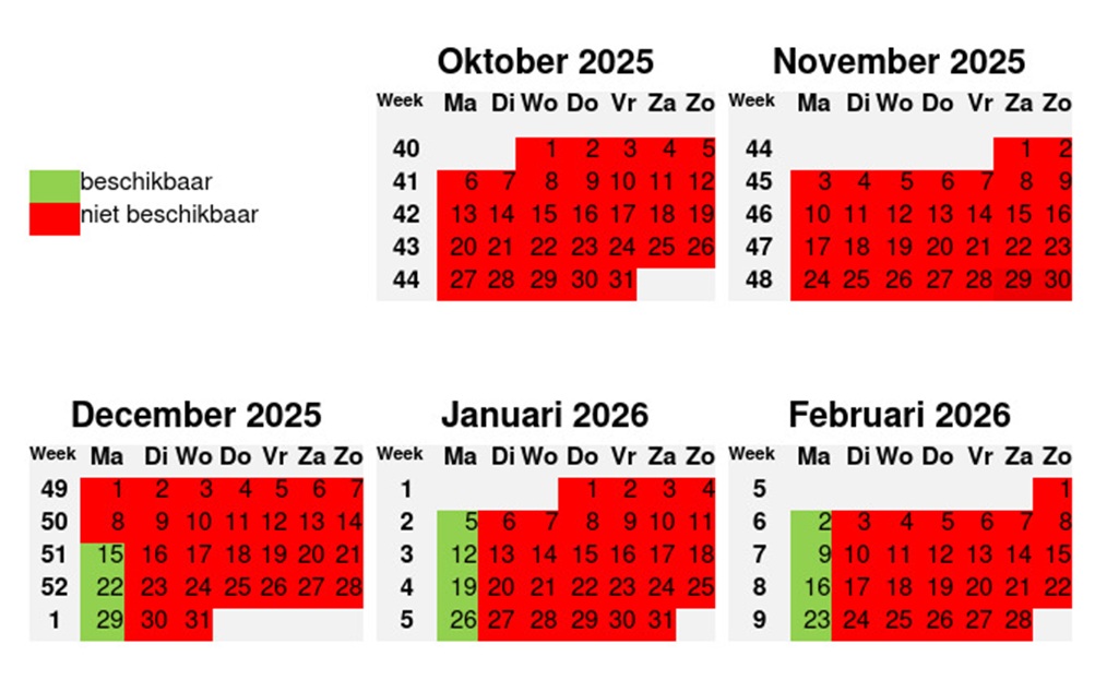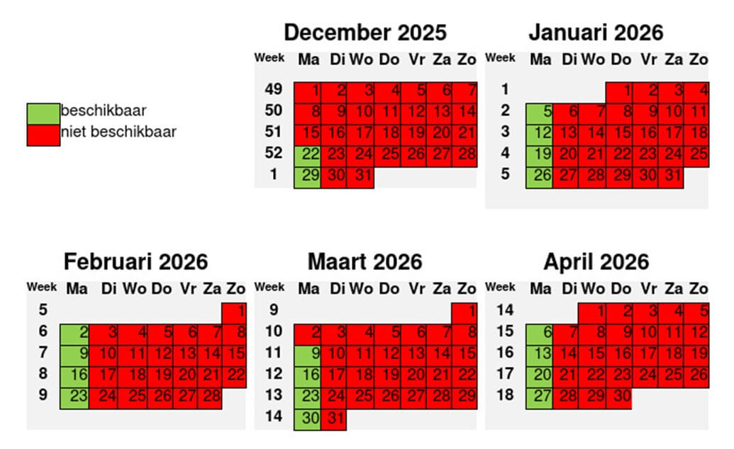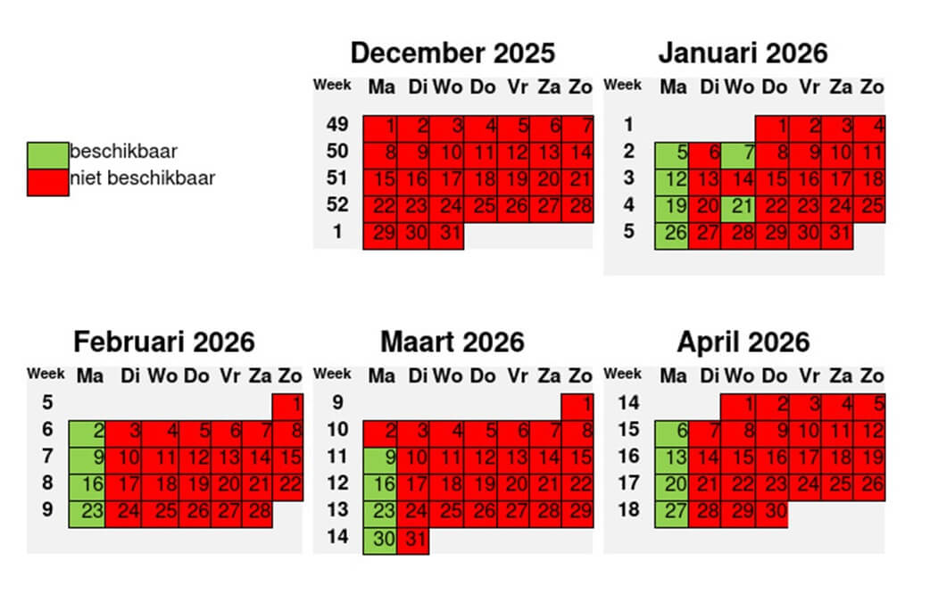 Hieronder vind je de beschikbare datums voor het aanplanten. Bij een bestelling via de online webshop kan je uit de beschikbare datums de gewenste datum uitkiezen. Uiteraard wordt het tijdstip waarop we beginnen tijdig medegedeeld. Als de gewenste datum niet beschikbaar is in de kalender, neem dan gerust contact met ons op. Wellicht dat er toch een mogelijkheid is om het op die dag in te plannen.