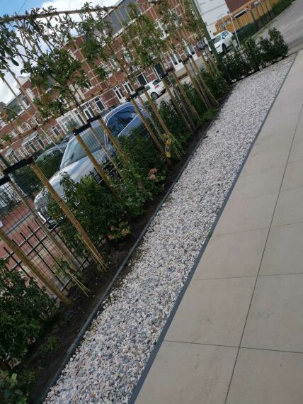 De tuin op de foto is strak en modern ingericht en in vlakken opgedeeld. De Portugese laurier komt daar uitstekend tot zijn recht. Let er bij het maken van de borders wel op dat er genoeg ruimte (minimaal 50 cm) overblijft voor de kluiten van de haag en voor de uitbreiding van het wortelstelsel. Ook is het raadzaam om eventuele bandjes niet af te smeren met cement, omdat het cement de wortels van de laurier kan aantasten.