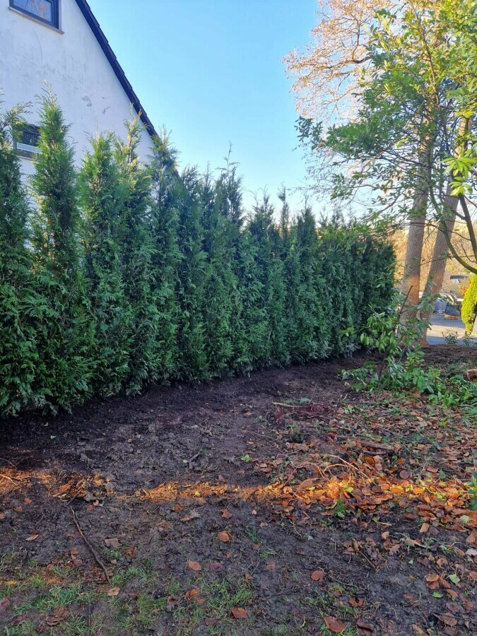 Van de Thuja plicata Martin 280-300 cm heb je 2,25 stuks per meter nodig. Deze conifeer kost € 72,- per stuk incusief aanplanten, bemeste potgrond en basisbemesting, wat uitkomt op € 162,- per meter.